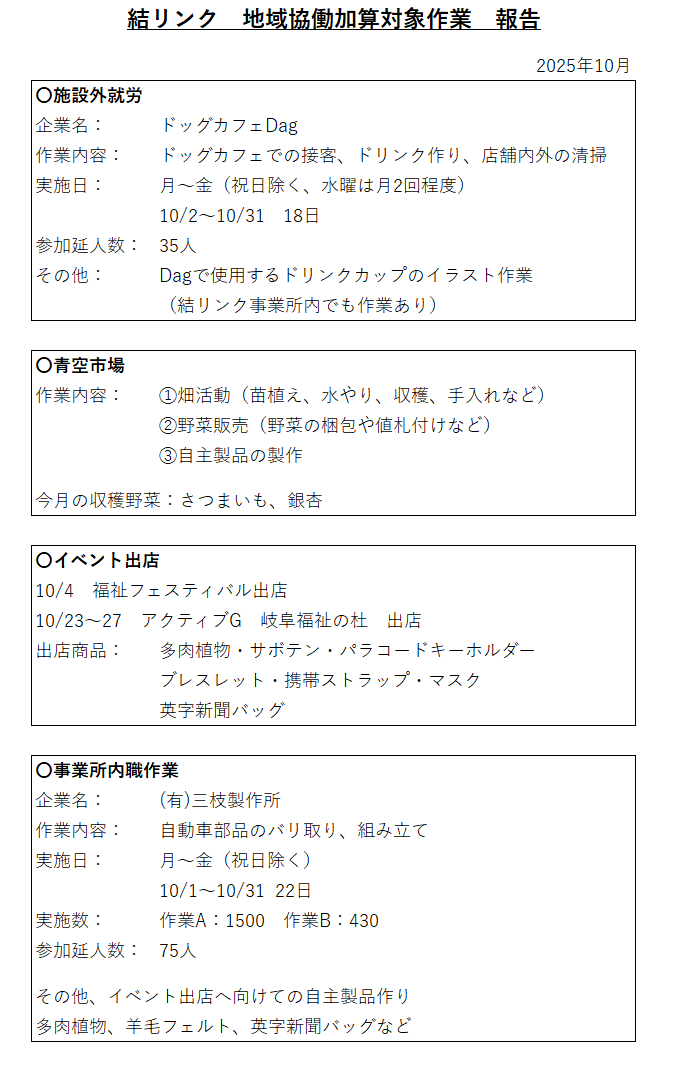 2025年10月の地域協働加算対象作業のご報告です。
