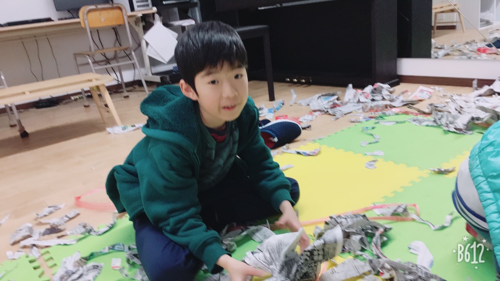 中には新聞紙を集めてくるくると丸めたあと、それを破る前の新聞紙で包み、何やら工作を始める子も(*^_^*)