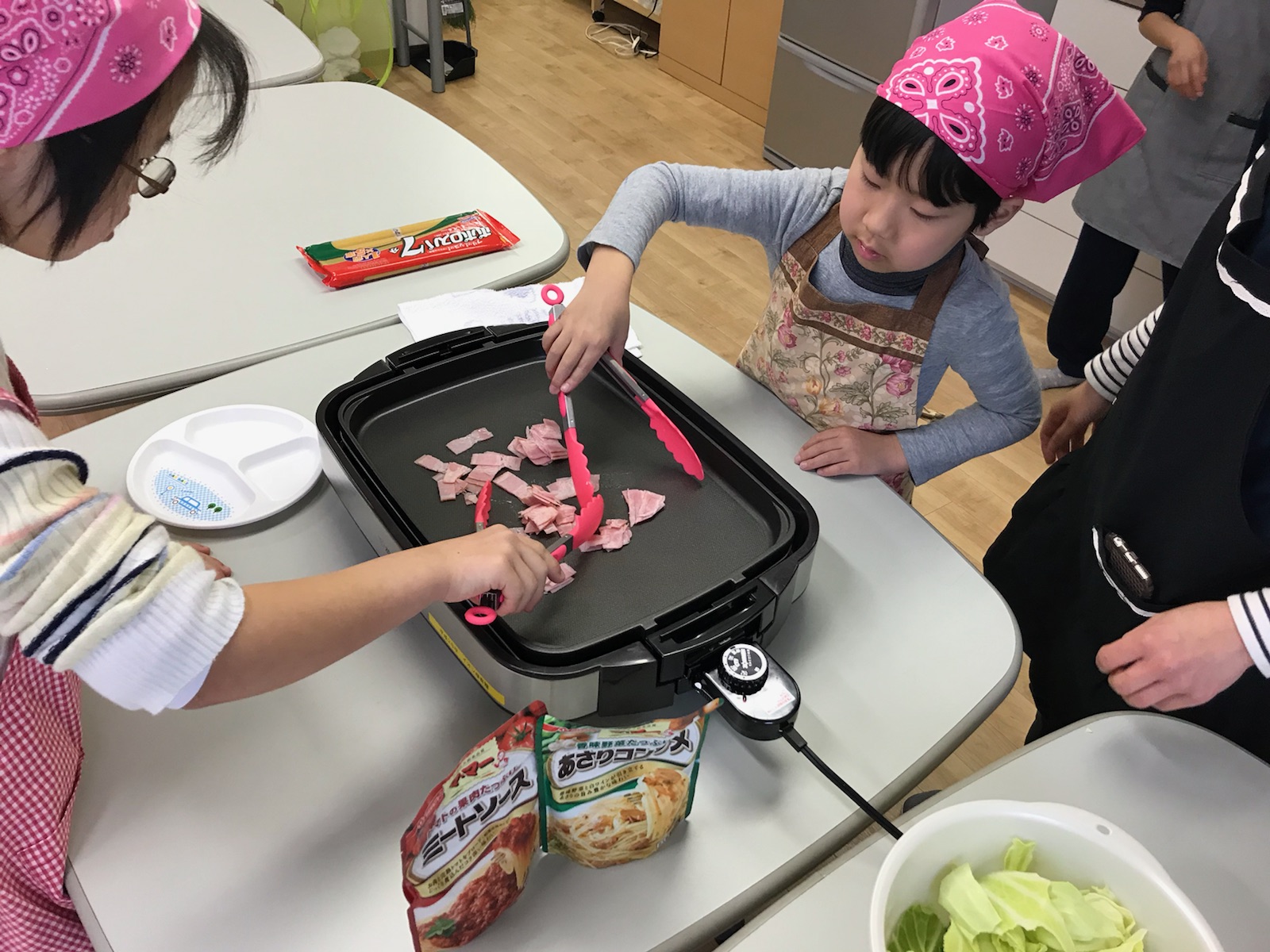 こんにちは。3月のクッキングではホットプレートを使って、キャベツとベーコンのパスタを作りました。