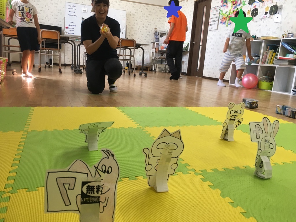 完成した空気砲を使って、的当てゲームを行いました。職員お手製の1~7の数字が書かれた的に、ティッシュペーパーを丸めて作った玉を飛ばして当てるゲームです。今回は、的とは別に1~7の数字が書かれた箱と動物カードを用意し、当てた的の数字と同じ数字の箱から好きな動物カードを選んでゲットするというオリジナルゲームを考えました(*^u^*)